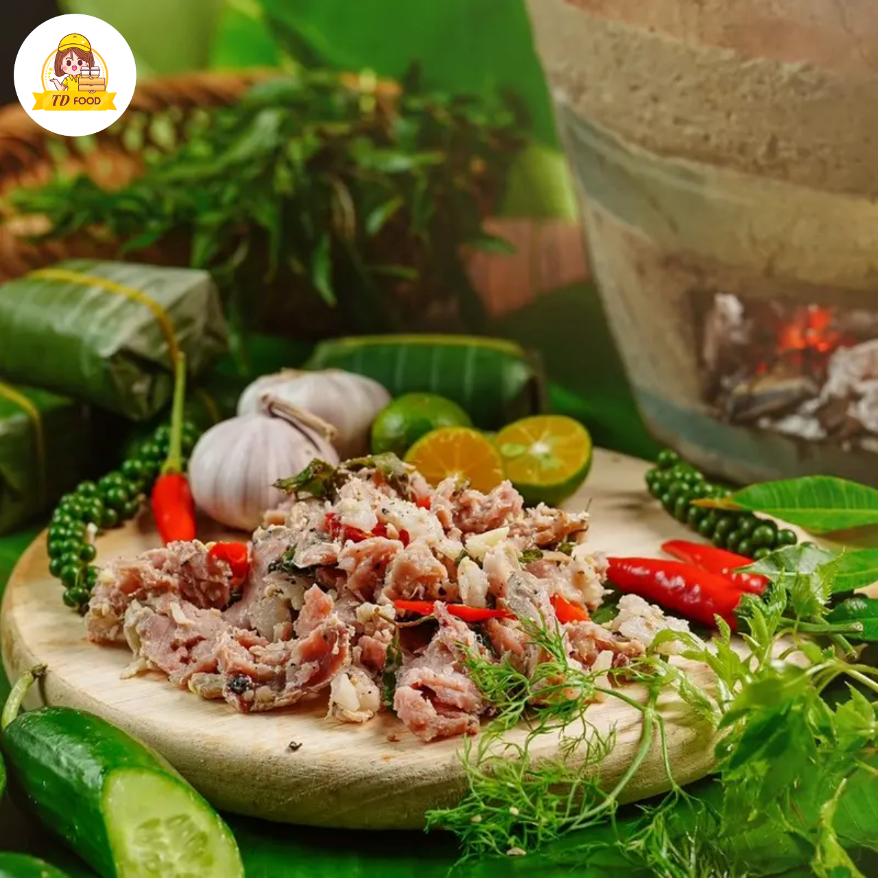 Được làm từ thịt thăn heo lọc sạch gân và mỡ lưng giòn béo, kết hợp cùng các loại gia vị như tỏi, ớt, riềng, tiêu Tiên Phước… lên men tự nhiên cho ra hương vị chua thanh, thơm nhẹ, cay dịu và béo vừa phải – chuẩn vị miền Trung.